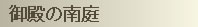 | 宸殿の南側の庭園を御殿の南庭と呼びます。宸殿の南側には左近の桜・右近の橘が植えられており、一面に敷きつめた白砂と、杉木立や松を配した北庭と比べると簡素なものとなっております。この庭園は、明治の御殿再建の時に新たに作られたものです。 |