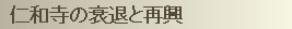 | 平安から鎌倉にかけて貴族に庇護されたことより仁和寺は大きく栄えましたが、鎌倉後期に武家が台頭し、また仏教も禅宗が盛んとなることより、衰退の一途をたどります。また、室町第八代将軍足利義政の後継ぎ争いにより京都は戦火となり、建築物をすべて焼失しました。その後、思うように再興することができず、江戸時代に入り徳川三代将軍家光により現在の仁和寺を再興されまされました。 |